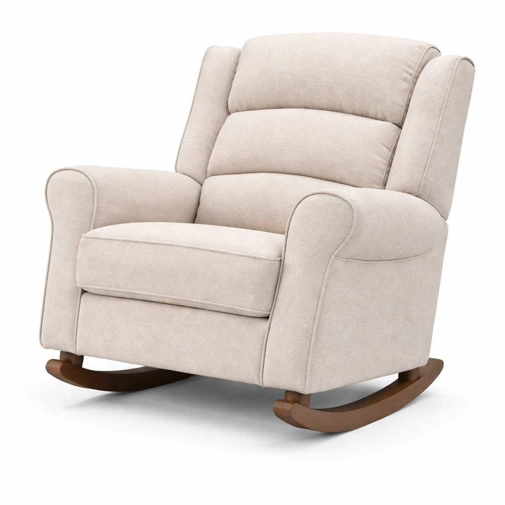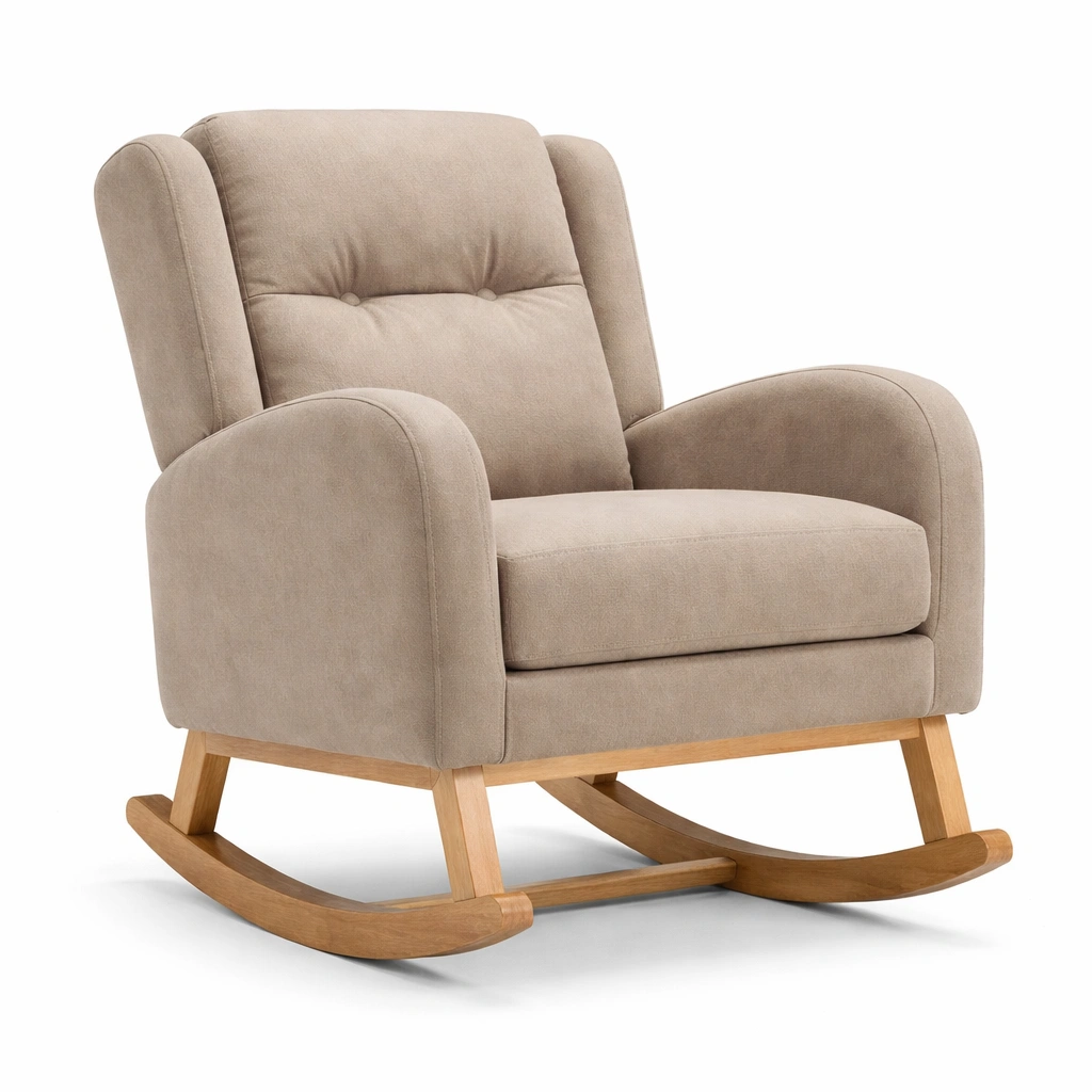 Silla mecedora de poliéster beige con base de madera