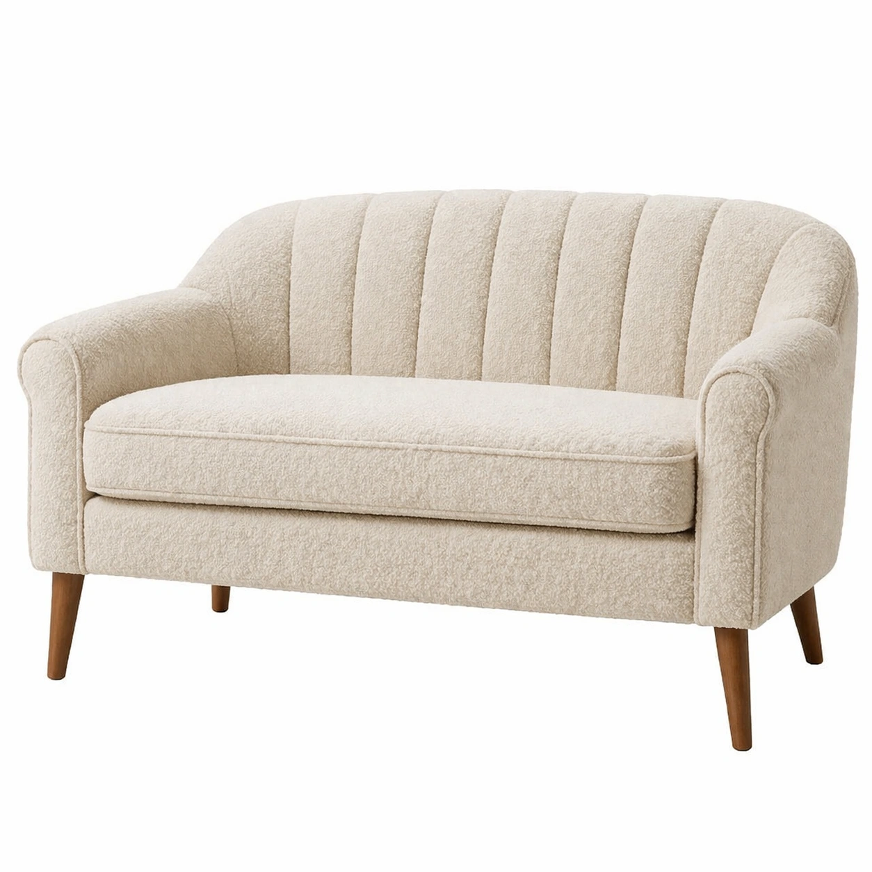 Sofá de dos plazas de tela bouclé beige con patas de madera