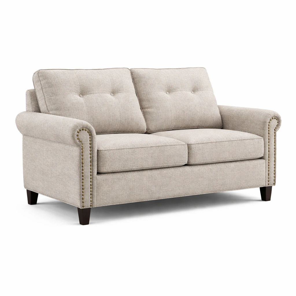 Sofá de dos plazas en tela de poliéster beige y patas de madera
