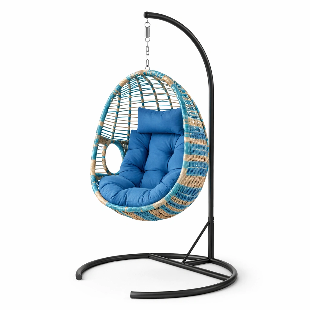 La silla colgante está fabricada en ratán sintético resistente, con un cojín de poliéster en color azul. El soporte es de acero con recubrimiento en polvo negro.