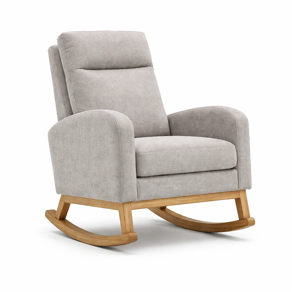 Este sillón mecedora cuenta con una base de madera de roble y está tapizado en tela de poliéster gris. Las dimensiones son 97 cm de altura, 81 cm de ancho y 87 cm de profundidad, con una altura de asiento de 45 cm. Peso aproximado de 20 kg. La función de balanceo añade comodidad. Se limpia fácilmente con un paño húmedo.