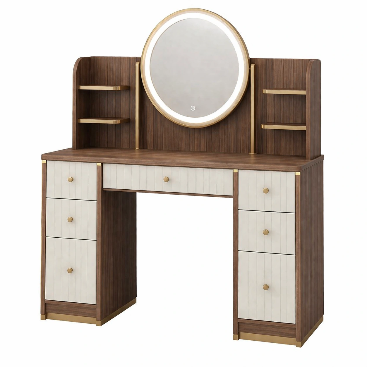 Características: Espejo redondo con iluminación LED, 7 cajones, estantes laterales